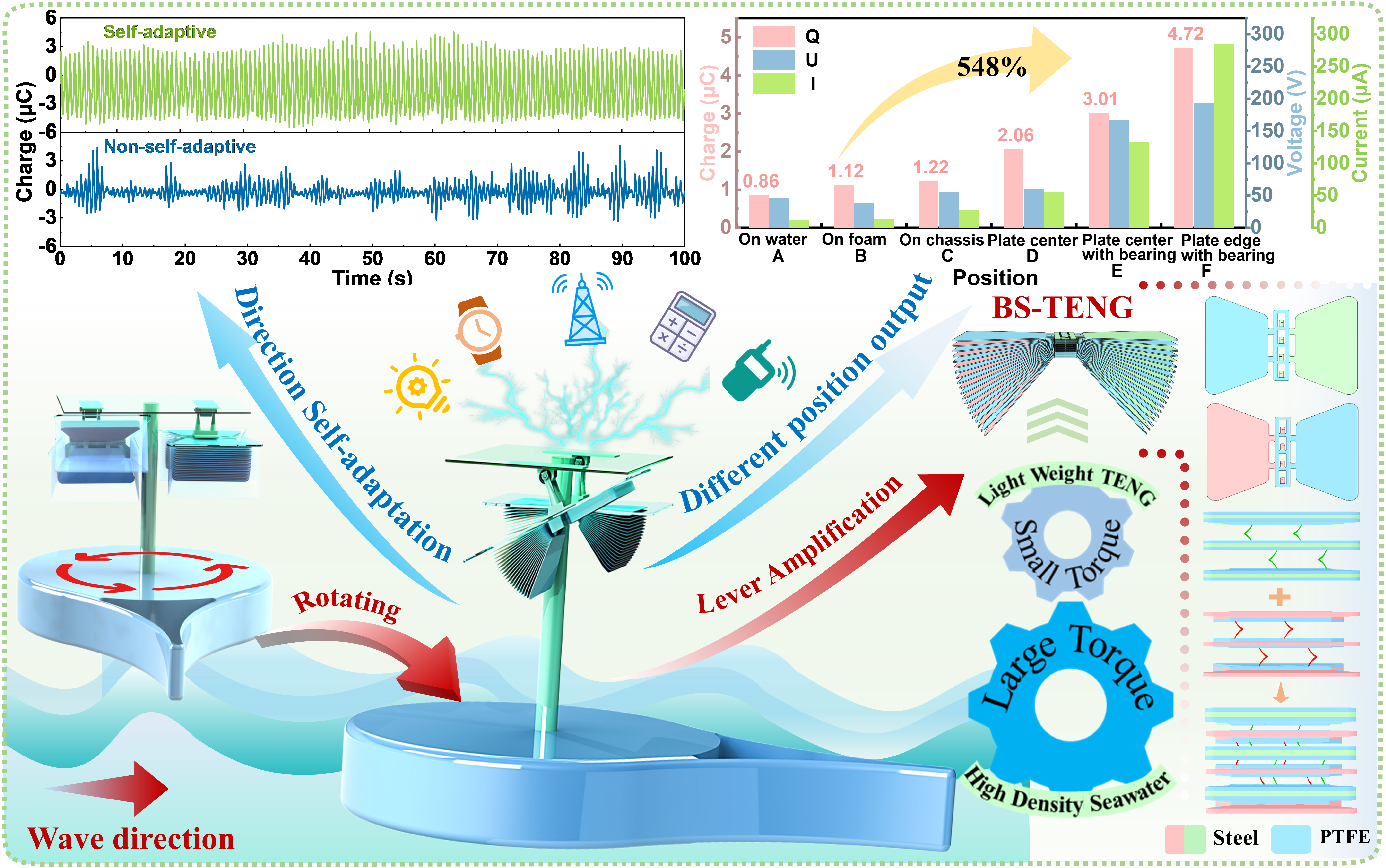 为了解决以上问题,金年会蓝色能源团队设计了基于自适应平台的仿生向日葵方向调整策略以及相应的新型蝶形堆叠摩擦纳米发电机(Butterfly-stacked triboelectric nanogenerator, BS-TENG)。该系统不仅可以在无额外电力消耗下自动调整自适应平台朝向使其对准波浪方向,从而使悬挂其上的BS-TENG高效捕获波能。还利用了杠杆原理将低振幅、高扭矩的波浪能转化为高振幅、低扭矩的动能,从而使致密摩擦层能够充分地接触分离,在弱波条件下与直接漂浮水面的BS-TENG相比,基于自适应平台的BS-TENG电荷输出提高了548%,显著提高了能量利用率。BS-TENG由半覆膜激光蚀刻的Si-Mn 弹簧钢板制成,消除了内部布线、框架和惯性质量。这种超轻设计简化了制造和材料消耗,实现了6.75 cm²g-1的质量摩擦面密度(SSA)。系统研究了该平台的工作机理和输出特性,单个BS-TENG的最大转移电荷量达到了13.68 μC,并证明了有效收集弱波能量为多个电子设备供电的可行性。该策略可与各种收集波浪能的TENG 轻松集成,为弱波浪能收集提供了一种可扩展且经济高效的解决方案。
