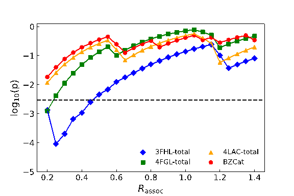 我们考虑了0.2-1.4度的成协半径,以0.05度为一步,即当发现Fermi-LAT源表中的源在热点的成协半径内时,认为这是一例成协事件,通过10的5次方的MC模拟,我们得到了与IceCube中微子热点数据最具有相关性的源表是3FHL源表,模拟结果如图1所示,其中,蓝色的线是3FHL源表得到的与IceCube中微子的相关性随成协半径的演化,当成协半径为0.25度时,在进行统计学惩罚之前的置信度大约为3.9σ,同时,我们也用其他类似工作中的蒙特卡洛模拟方法对我们的结果进行了交叉检验,发现并不会影响我们的结果。