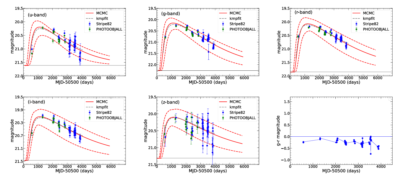Fig.1: Long-term light curves in SDSS ugriz-bands and the TDE model determined best descriptions and the corresponding confidence bands.