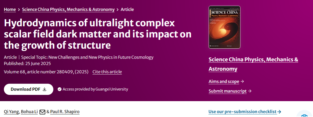 近日,我院宇宙学团队在暗物质研究领域取得新进展。研究结果以题目为“Hydrodynamics of ultralight complex scalar field dark matter and its impact on the growth of structure”的论文发表在中国科学院一区期刊Science China Physics, Mechanics & Astronomy (SCPMA)。论文的第一作者为金年会2023级硕士研究生杨祺,通讯作者为金年会助理教授李博华。我校为论文的第一单位及唯一通讯单位。