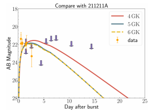 图2:模拟得到的r波段光变曲线与GRB 211211A的观测数据进行对
